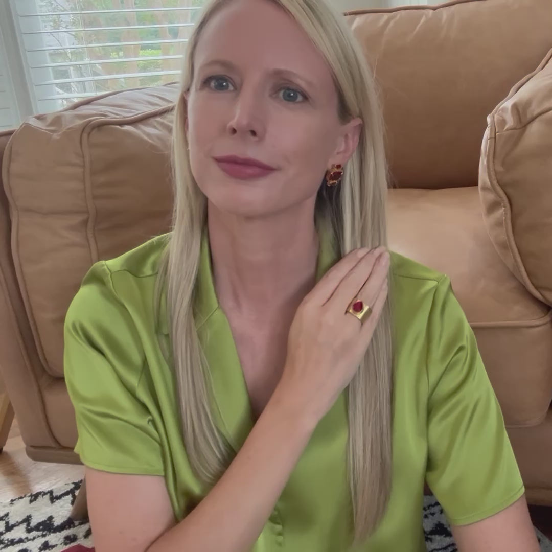 Striking and sophisticated, these gold stud earrings feature bold red semi precious ruby gemstones framed in ornate textured settings. The geometric design and vibrant color evoke a sense of timeless glamour and confidence. Perfect for adding a touch of fiery elegance to both day and evening ensembles.