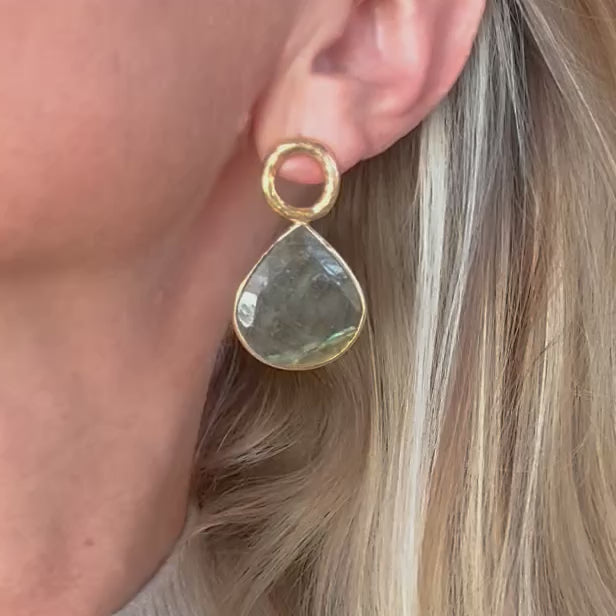 Elegant and luminous, these earrings feature teardrop-shaped gray-brown labradorite stones framed in textured gold. The soft iridescent tones catch the light beautifully, while the circular top design adds a touch of modern artistry. A refined statement piece that transitions effortlessly from day to evening.